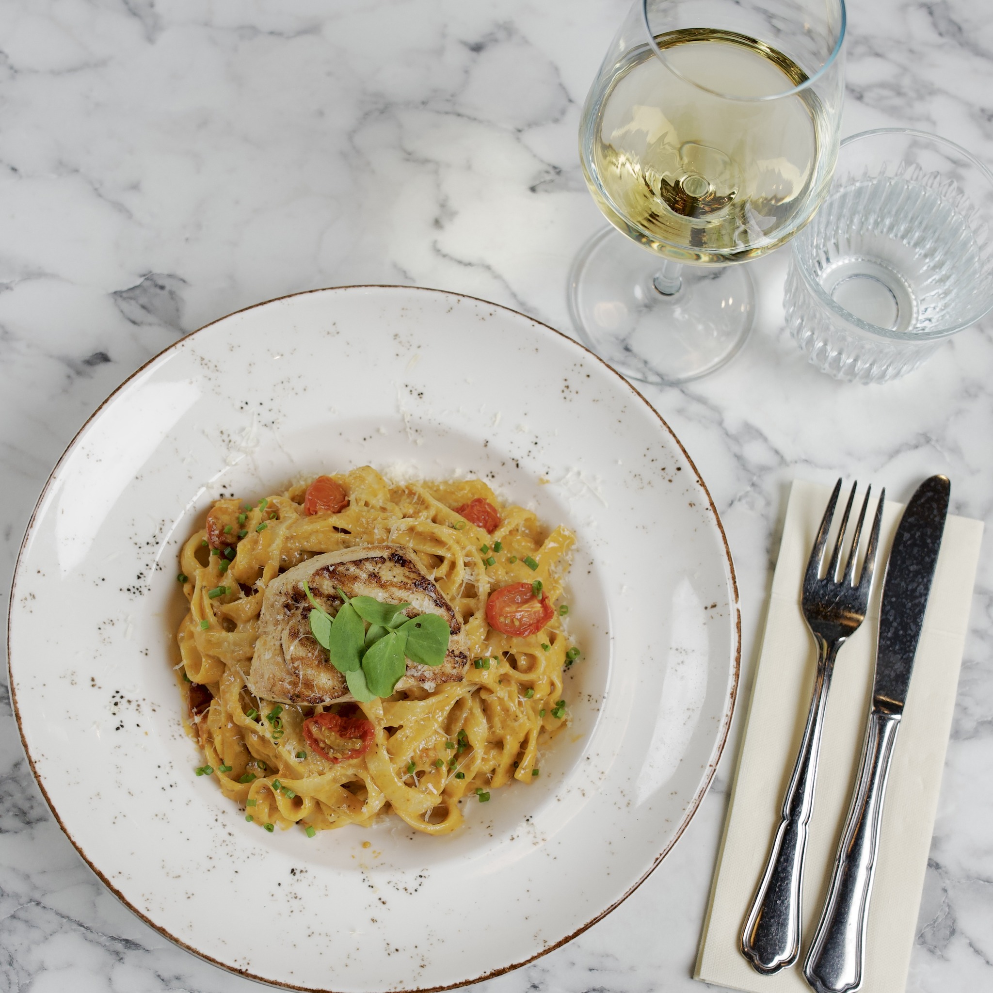 Marineret unghanebryst med á la crème, grillede grøntsager og pomfritter